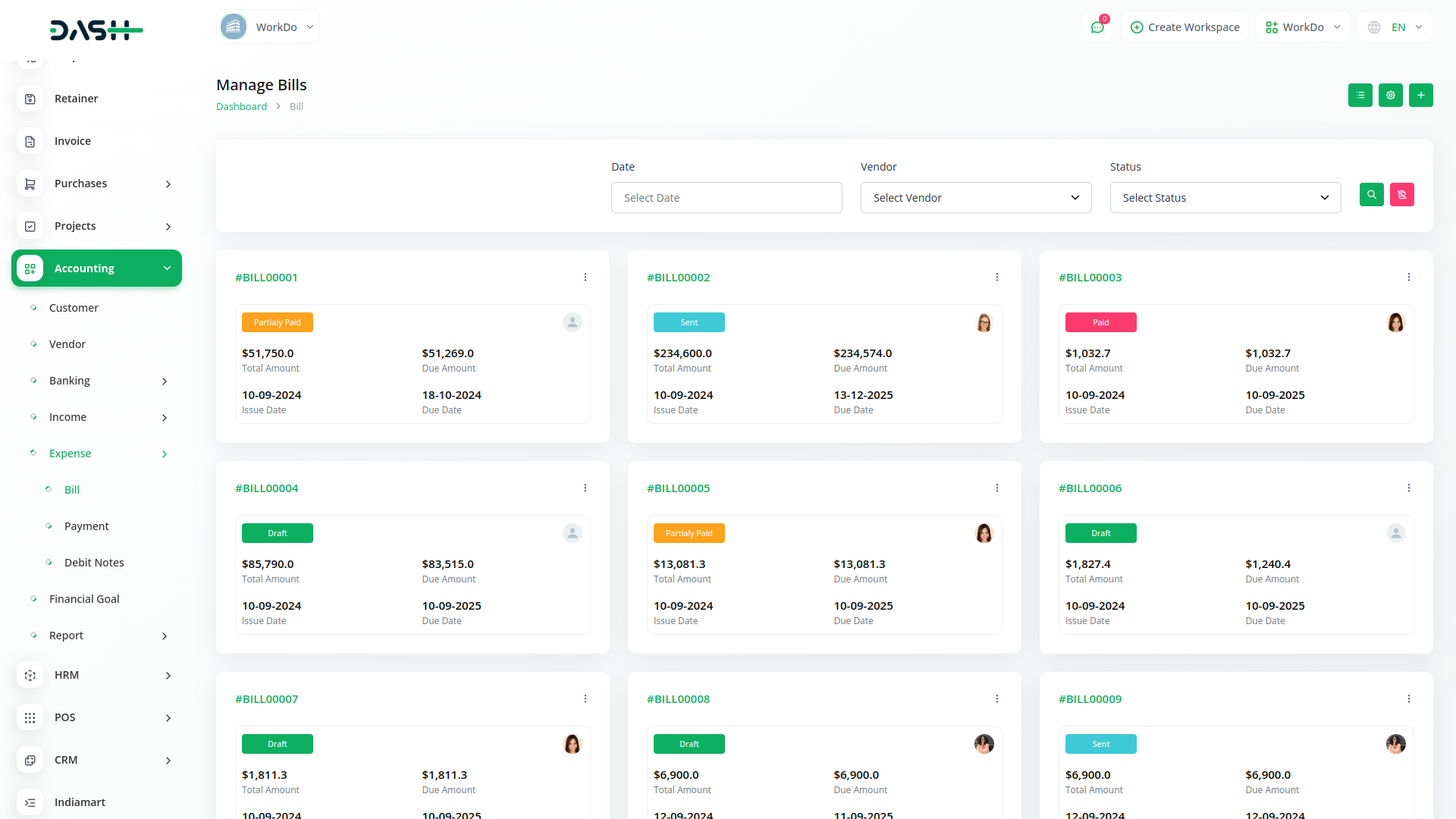 A budget is a financial plan for a specified period to keep in check with the working capital. This feature here helps to maintain the capital flow. You can set monthly, quarterly, half-yearly, or yearly budgets according to your business plans and needs. The main categories are “Income” and “Expense” where one can edit /update /delete the sub-categories as well.